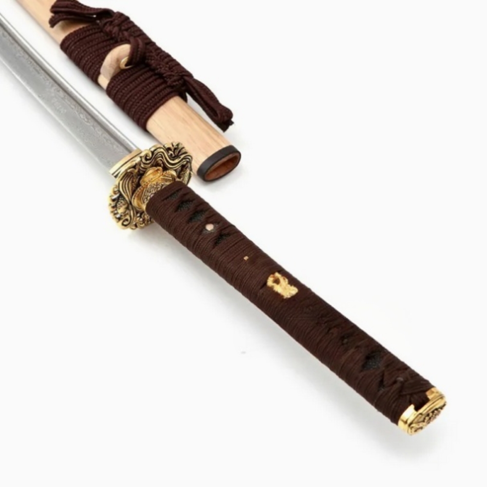 A katana megvásárolható fa díszdobozban, selyem kardzsákkal, fekete kardállvánnyal és tisztítószettel.