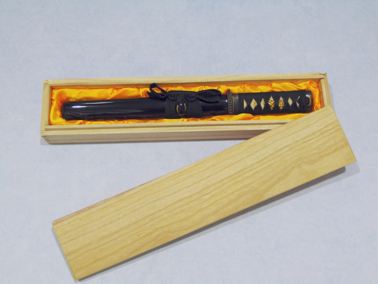 Damaszkolt acélból készített, élezett japán tőr. A tsuba acél, a markolat rájabőr és pamut borítású. A fa díszdobozban kínált tőr egy jó ajándékötlet a japán fegyverek rajongóinak.
