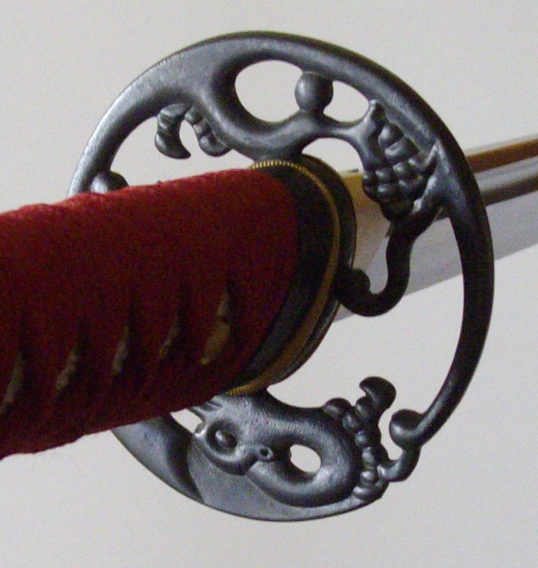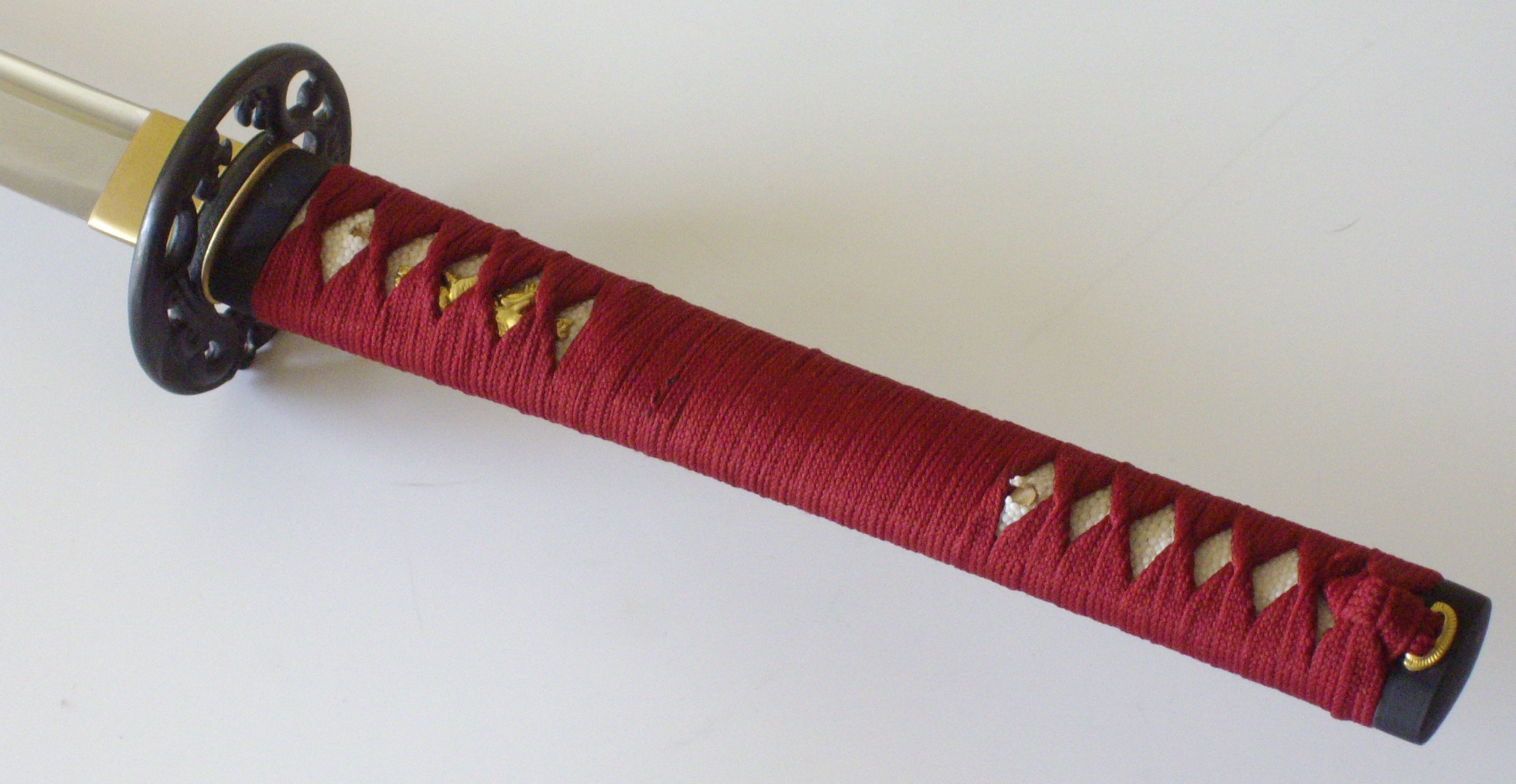 A penge 2 db markolatcsappal (mekugival) rögzített. A markolat (tsuka) kötőszalagja (tsuka ito) bordó pamut, alatta eredeti rájabőr van.