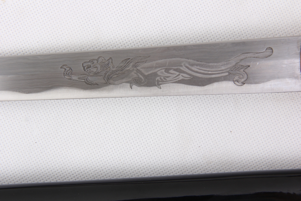 A sárkány motívummal készített tőr pengéje rétegelt kovácsolással (damaszkolás) készül, élezett.