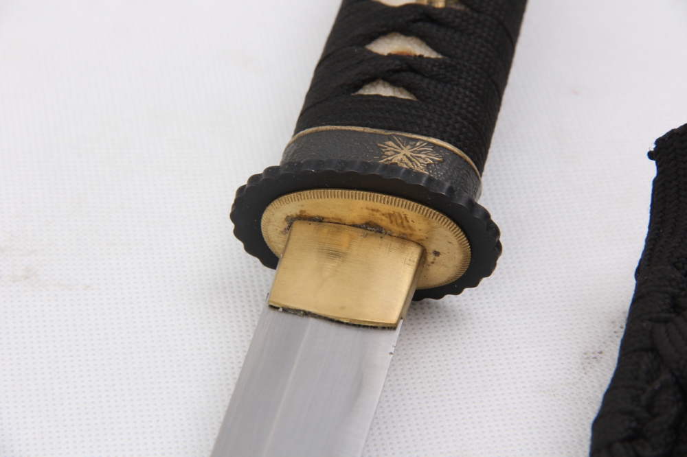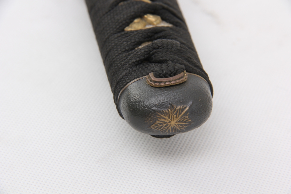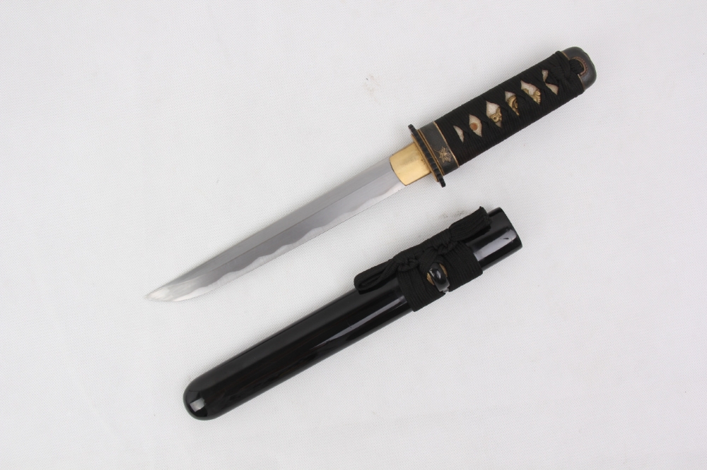 Damaszkolt acélból készített, élezett japán egyenes pengéjű tőr.