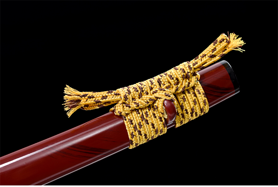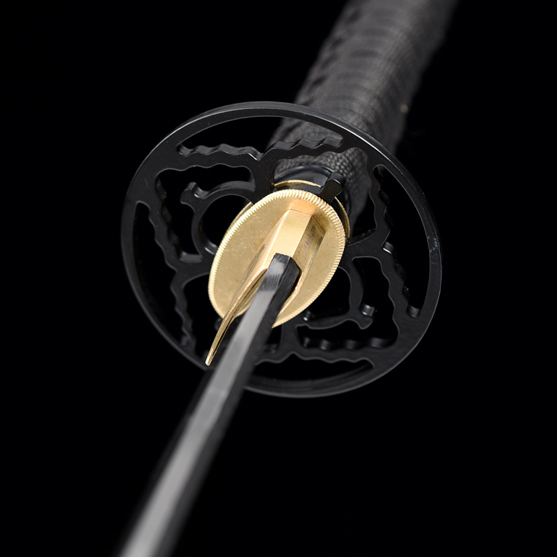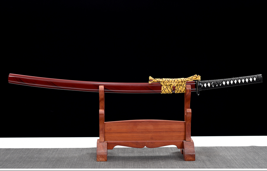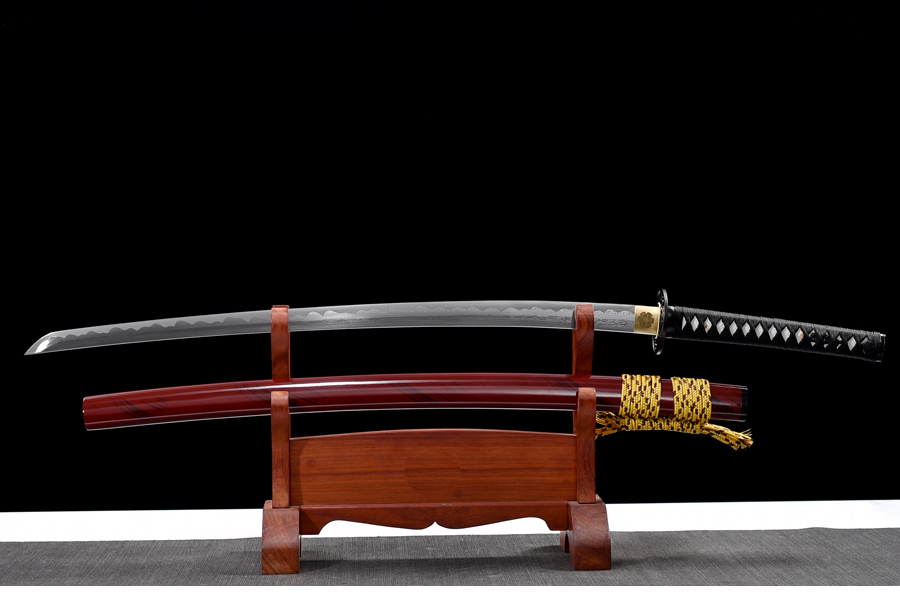 Rétegelt kovácsolással (damaszkolás), 1060 típusú szénacélból készült katana. A kard vágógyakorlatra nem alkalmas!