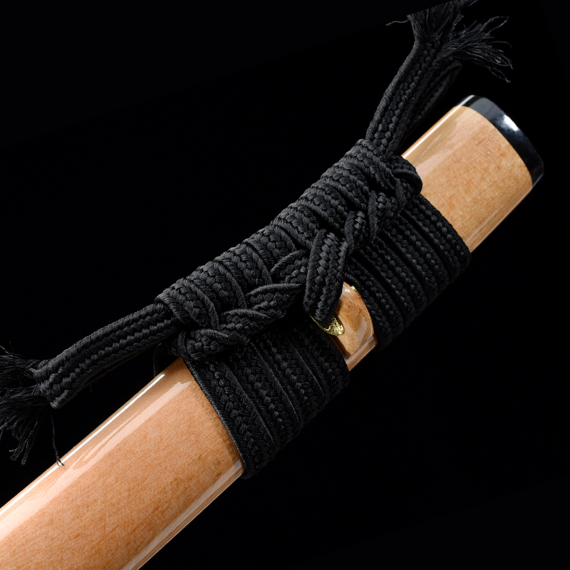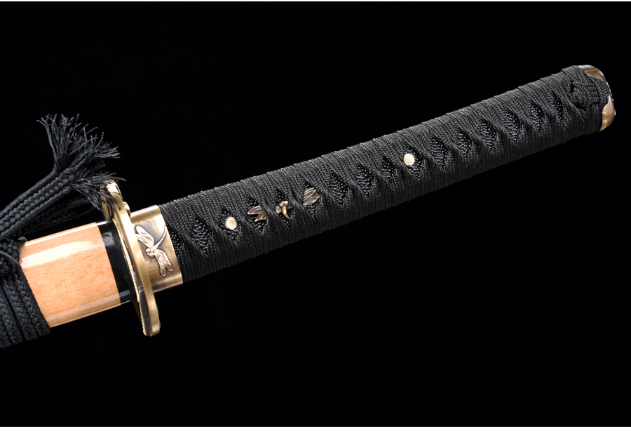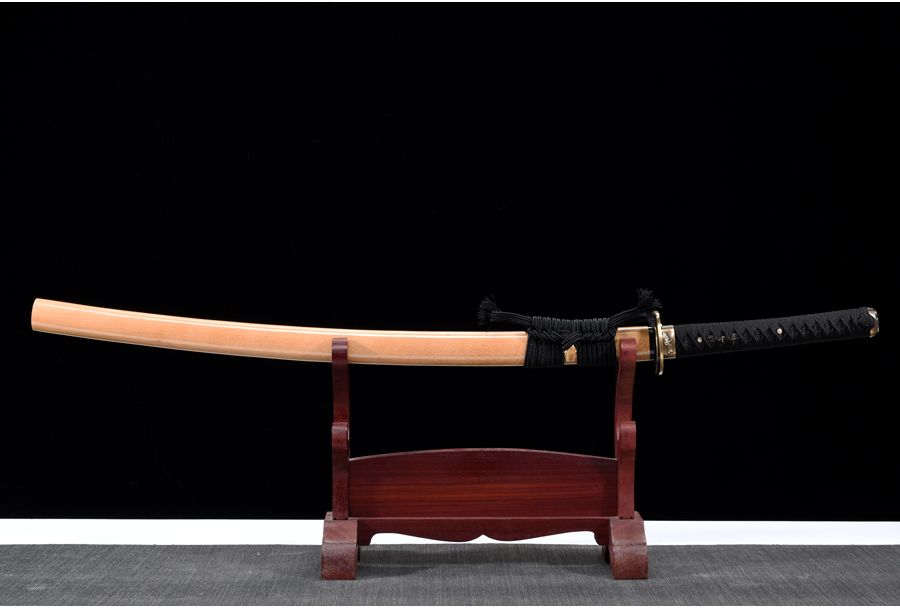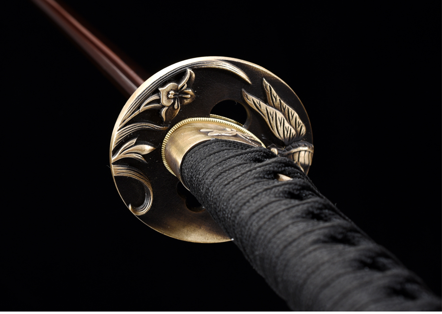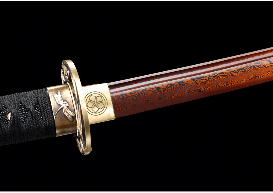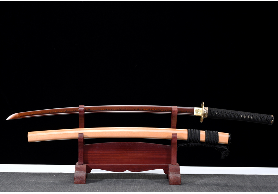 Rétegelt kovácsolással (damaszkolás), 1060 típusú szénacélból készült katana. A penge színe vörös-fekete. A kard vágógyakorlatra nem alkalmas!